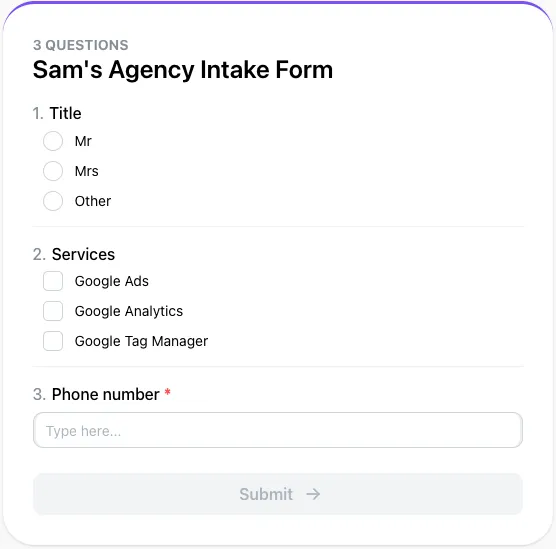 AgencyAccess replaces this chaos with a structured Intake Form built directly into your onboarding flow. Clients answer the right questions once, in the right context, while they're already setting up access. You get clean, complete inputs — without chasing anyone.